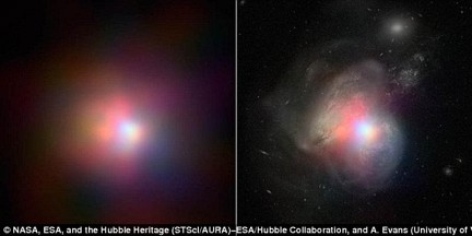 Коллаж создан из фотоснимков телескопа Хаббл и ядерного спектроскопического телескопа NuSTAR. На кадрах видны две сталкивающиеся галактики, удаленные на 134 миллионов световых лет от Земли. Их общее название — Arp 299. Черная дыра одной из галактик расположена в правой части пары и быстро растет за счет поглощения газовых облаков.