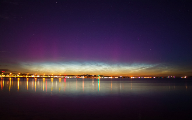 В Киле, Шлезвиг-Гольштейн, Германия, любителя ночного неба и необычных явлений Криса Кранича поджидал сюрприз. Охотясь на серебристые облака, сезон которых продолжается, Крис запечатлел 11 июля и северное сияние.