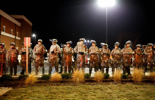 Демонстранты в Фергюсоне, где продолжаются протесты в связи с годовщиной гибели подростка-афроамериканца Майкла Брауна от рук полицейского, бросают в полицию различные предметы.